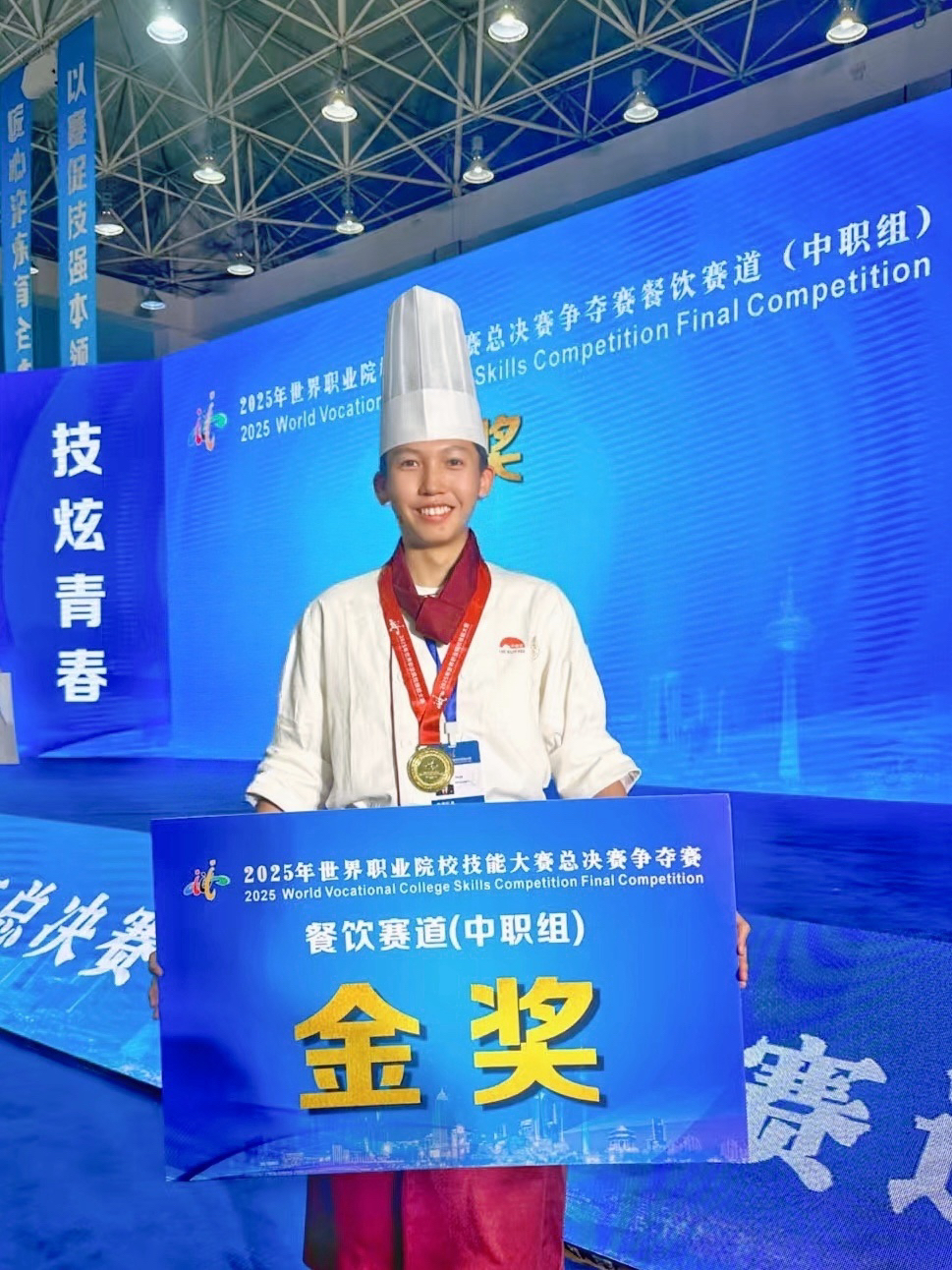 省赛的胜利还来不及回味,很快他便投入到国赛的紧张备战中,起早贪黑的练习,高强度集训,他与团队不断打磨作品、演练演讲,最终在世界职业院校技能大赛总决赛中优秀发挥,并克服设备突发故障等困难,勇夺餐饮赛项金奖。至此,他完成了从市赛、省赛,一路走至国赛的领奖舞台,展现了新生代厨师坚守匠心精神,传承与创新中华饮食文化的时代青年形象。